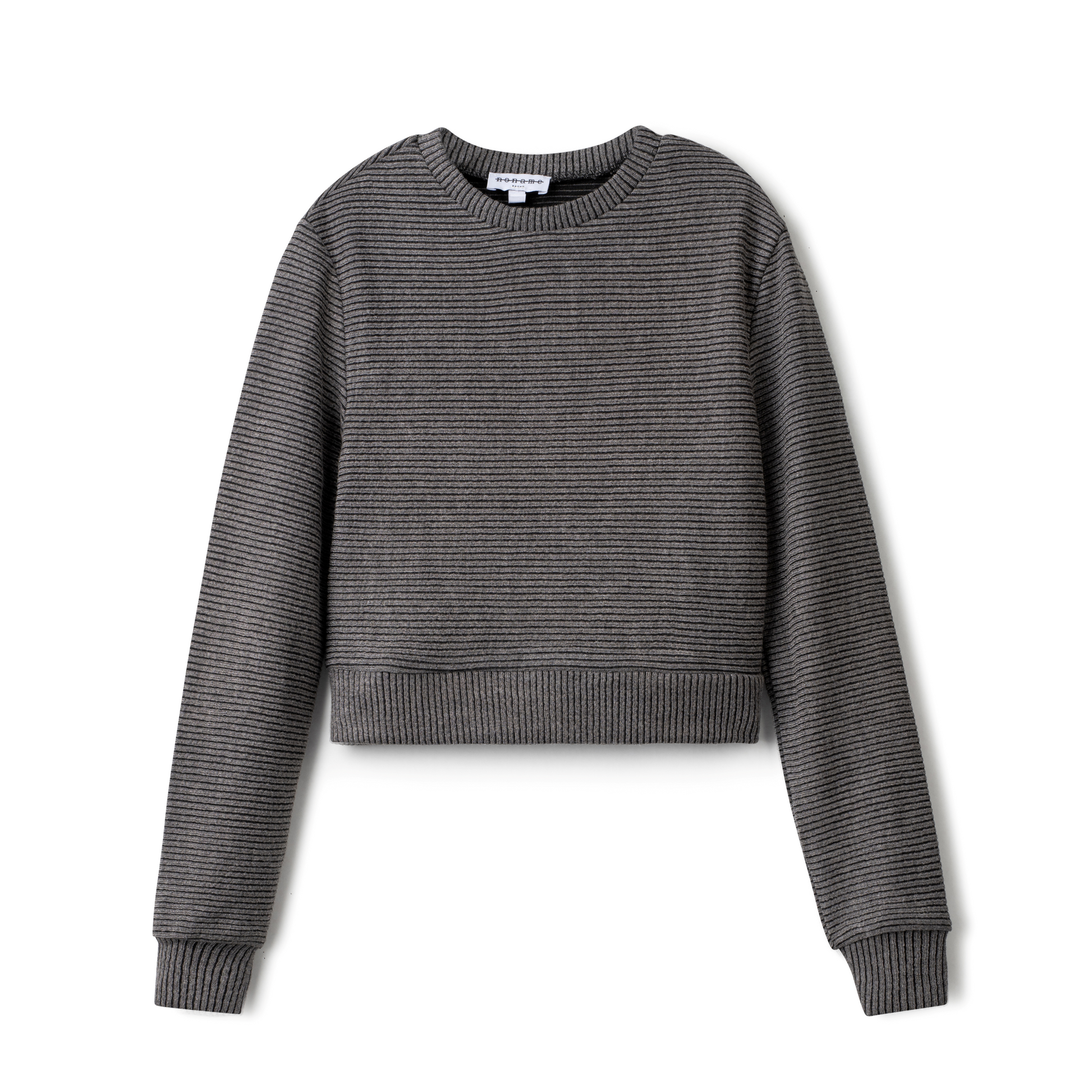 Our Textured Crop Sweater Is Crafted From A Warm, Ribbed Fabric With Grey And Black Stripes. It Has A Boxy Fit That Pairs Perfectly With Our Textured Draw String Midi Skirt. Stay Warm In Style With This Timeless Classic.