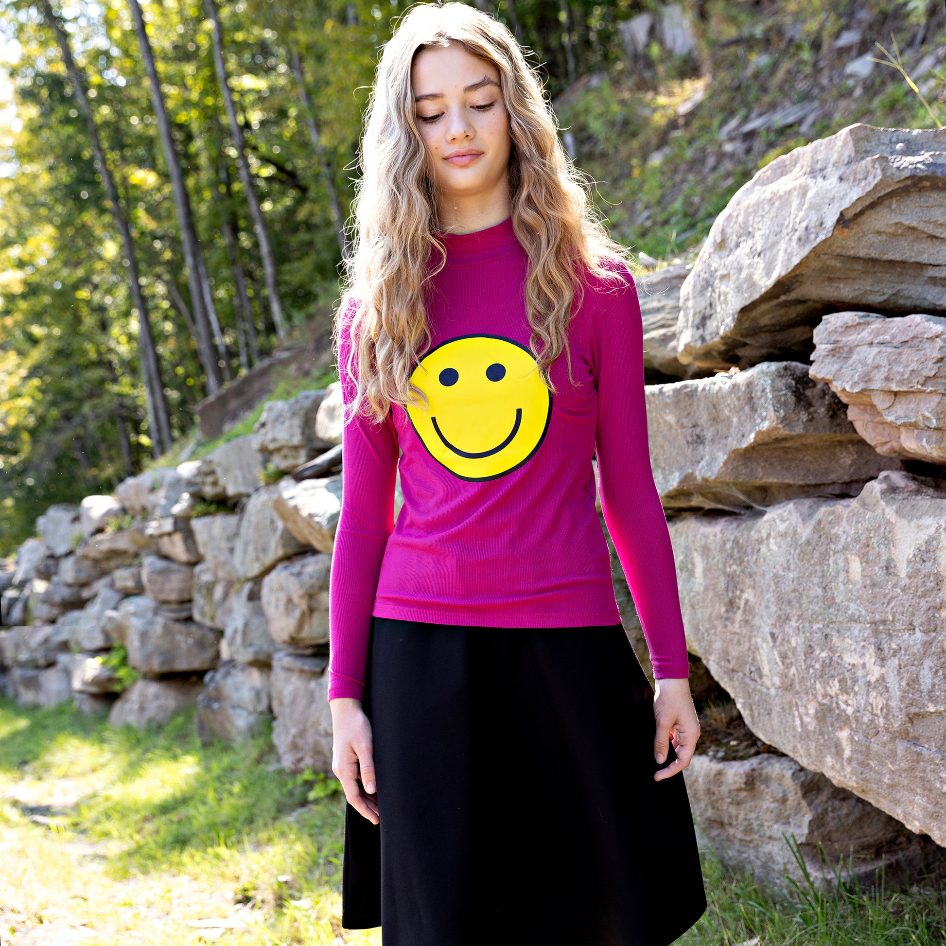 This Delicious Luxurious Mock Neck Magenta Tee Is Made From Luxuriously Soft Modal Fabric, Making It The Perfect Choice For Casual Days. It Features A Stylish Mock Neck And Is Accented With A Bold Smile Face Design. Enjoy A Comfortable, Breathable Fit For All Day Wear.
